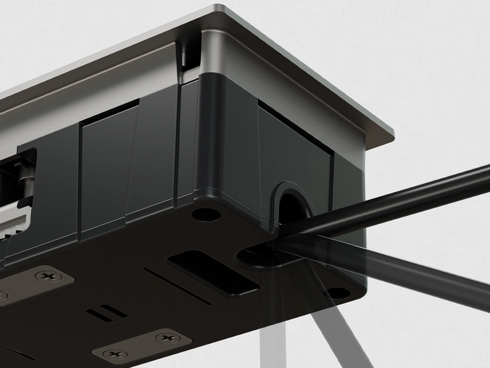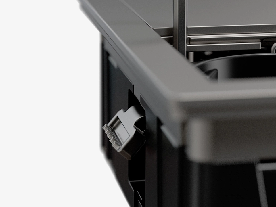 Il sistema di affrancamento tramite ganci mordenti in alluminio rende possibile l'installazione dall'alto. Questa caratteristica assicura non solo praticità, ma anche velocità nella fase di fissaggio, rendendo la multipresa non solo compatta ma anche facile da installare.